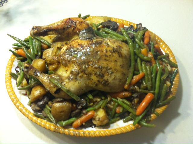 You’re going to let these cook until the internal temperature on the meat thermometer reaches about 165-175. It’s really okay if the thermometer has reached that temp when you add the green beans because they won’t take long to cook. By now your house is smelling mighty good from all the wonderful flavors coming from your oven–and now this one pot meal is done! You will not believe the beautiful presentation this meal makes. It’s truly the only centerpiece you need. And, although on this particular night I made a couple of additional sides to go with this dish, all you need is bread. Once you get it all on your serving dish, just let it sit for about 5 minutes or so before you slice into the chicken. That will give it time to rest and retain all of those great seasonings that make it so wonderfully juicy. Take a look at this beautiful meal.